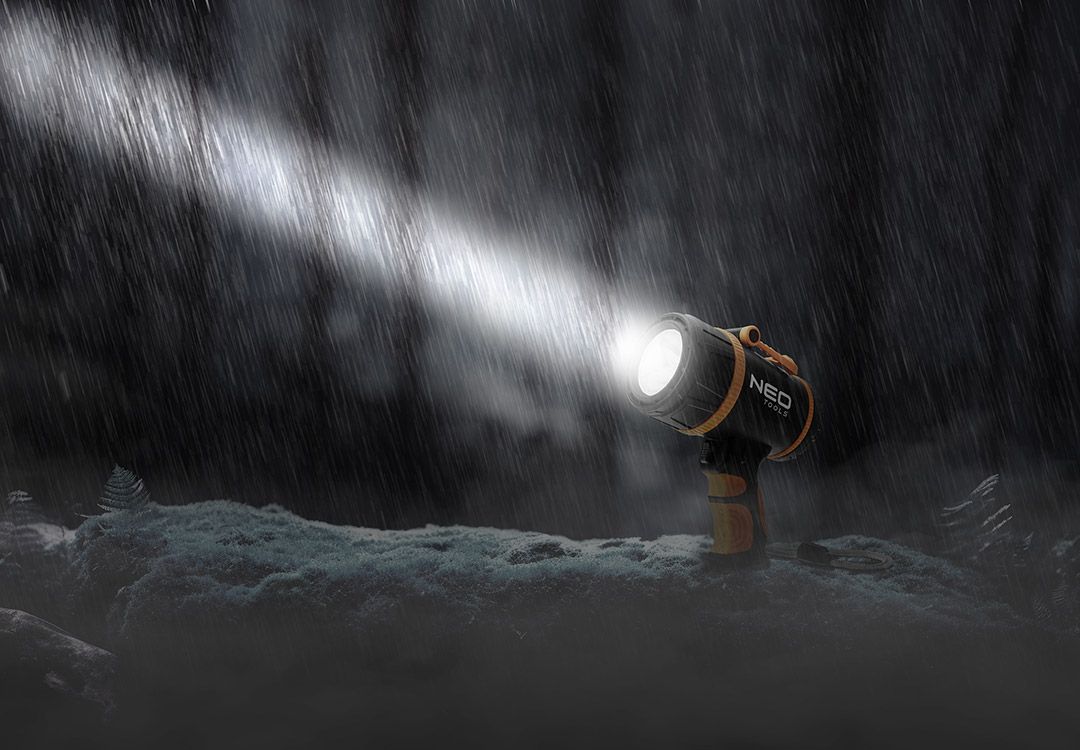 The 1000 lm searchlight 99-114 by NEO TOOLS is a lamp characterised by 1000 lm illumination, 5 W power and a range of 350 metres. It has a built-in SST40 LED. Its body is made of a durable combination of ABS and TPR. With an IP44 water and dustproof rating, it is resistant to various weather conditions. The built-in 18650 Lithium 3.7 V battery with a capacity of 4400 mAH provides 4 to 8 hours of operation, with a charging time of 6-7 hours. The NEO TOOLS searchlight has a POWER BANK function, 100%-50% functions, a long SOS button and a battery charge indicator. It is offered with a USB C cable, a practical wrist cord and an additional carrying handle. The ON/OFF safety button adds to the comfort of using this device. The NEO TOOLS lamp is distinguished by its small size (154 x 173 mm) and low weight of 490 g. It will prove itself in many circumstances - during everyday use as well as in extreme situations.